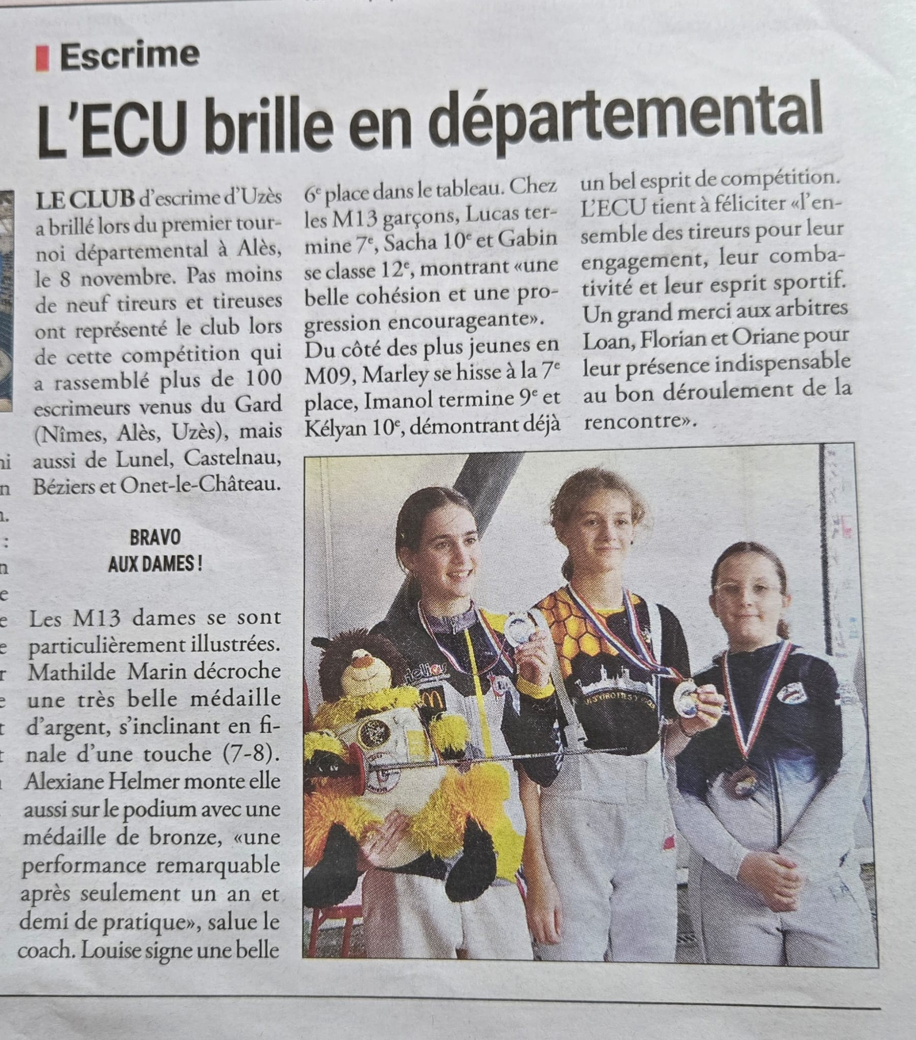 M13 DAME : médaille d'argent pour Mathilde, bronze pour Alexiane et une 6e place pour Louise. Chez les garçons Lucas 7e, Sacha 19e et Gabin 12e. Chez les M09 Marley 7e, Imanol 9e et Kélyan 10e.